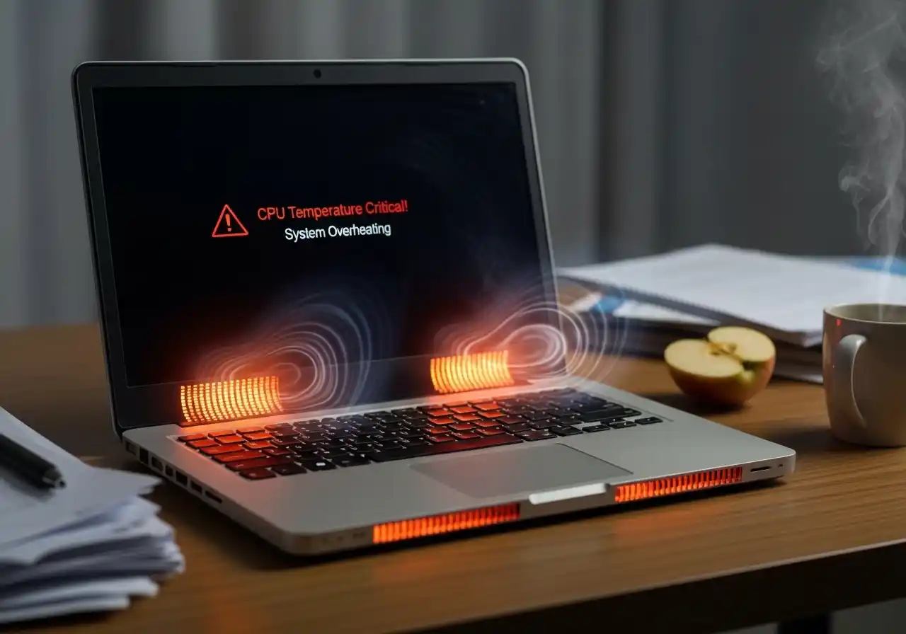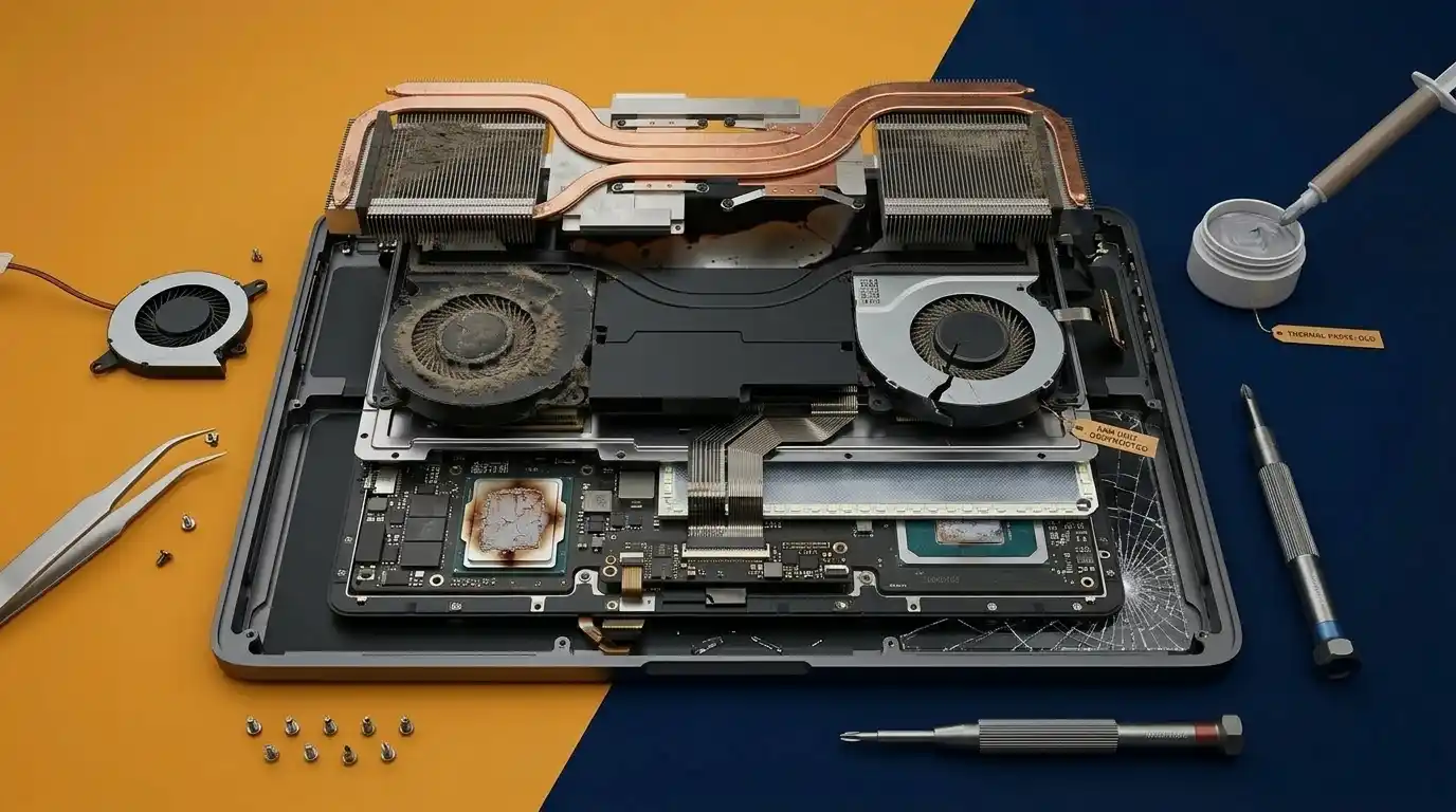Common signs include grinding or rattling noise from the bottom of the laptop, random shutdowns during normal use, a "Fan Error" message on boot (common on Lenovo ThinkPads), a fan that runs at maximum speed constantly, or a laptop that's slow during gaming or video editing due to thermal throttling. Any of these means it's time for laptop fan repair near me.